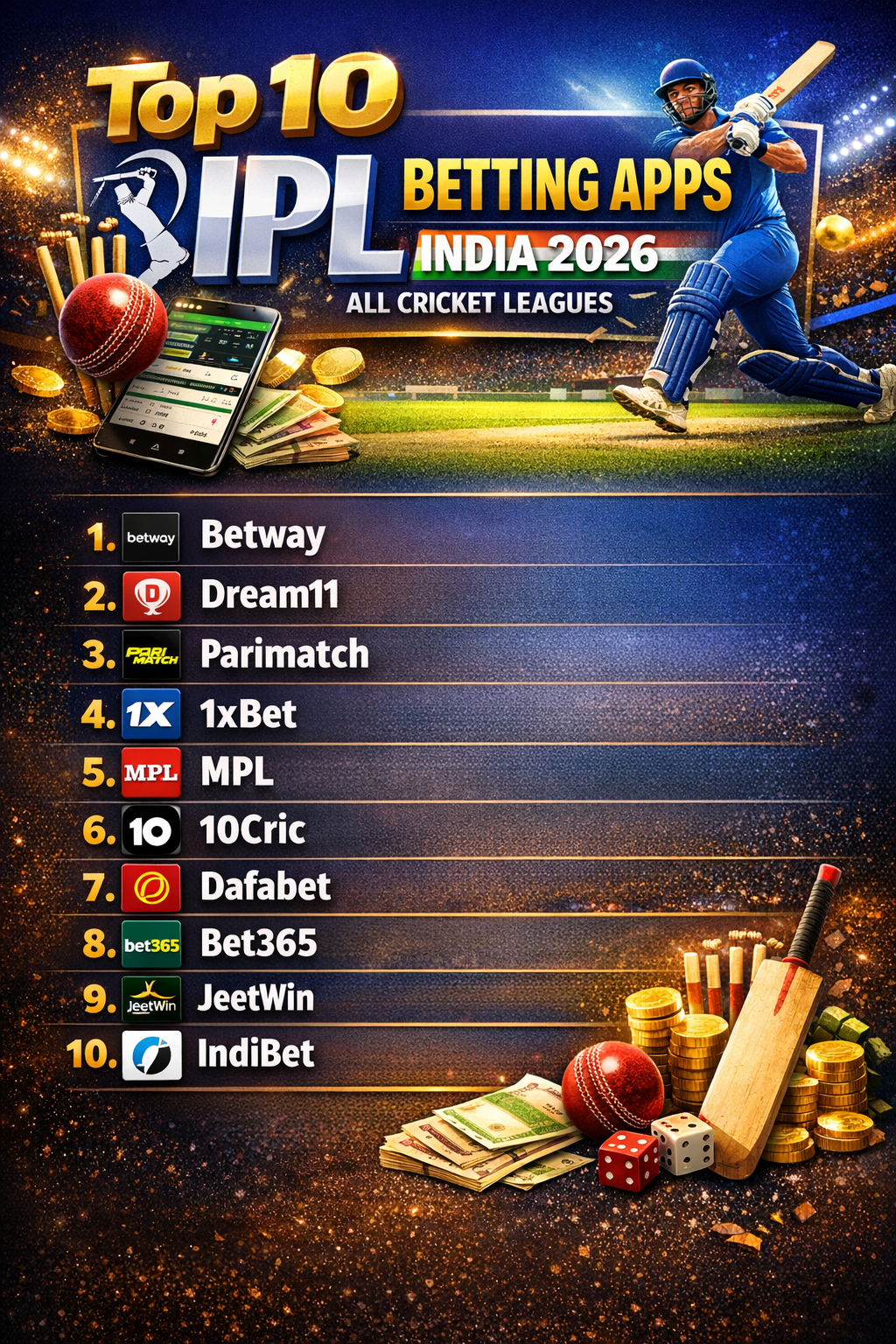 With IPL 2026 on the way, Indian cricket fans are on the hunt of the Top 10 IPL Betting Apps that provide safe IPL betting, live betting odds, and hassle-free UPI transactions. These are the Top 10 IPL Betting Apps India 2026 which are not only used to bet on the IPL matches but also on the T20 World Cup, domestic leagues, including the Big Bash and PSL as well as international series of Test and ODI. Be it RCB vs MI betting, or top run-scorers, all of these apps will put you in real-time markets, cash-outs, and instant withdrawals, which are optimized to Android APK downloads and iOs web access in India.